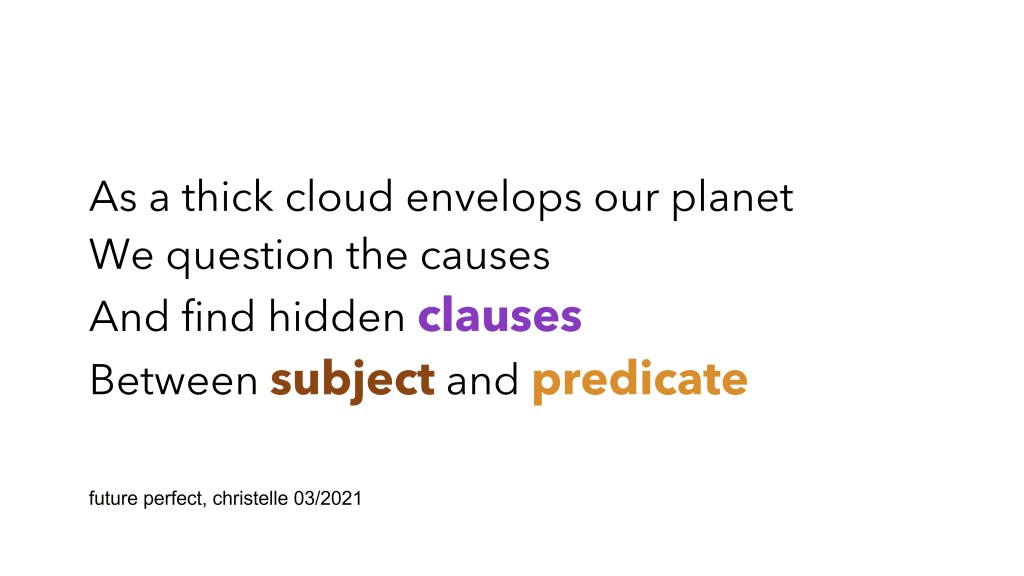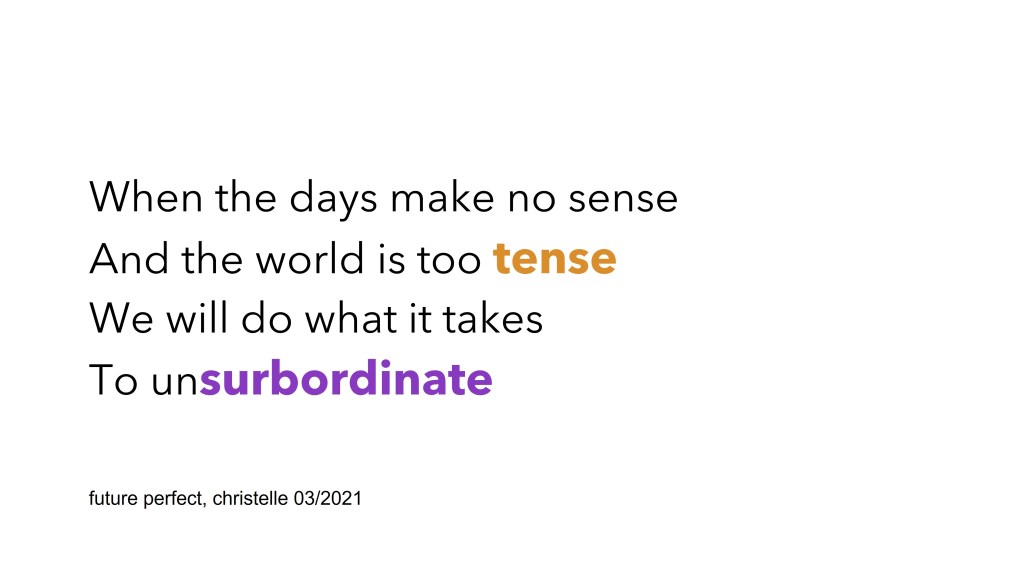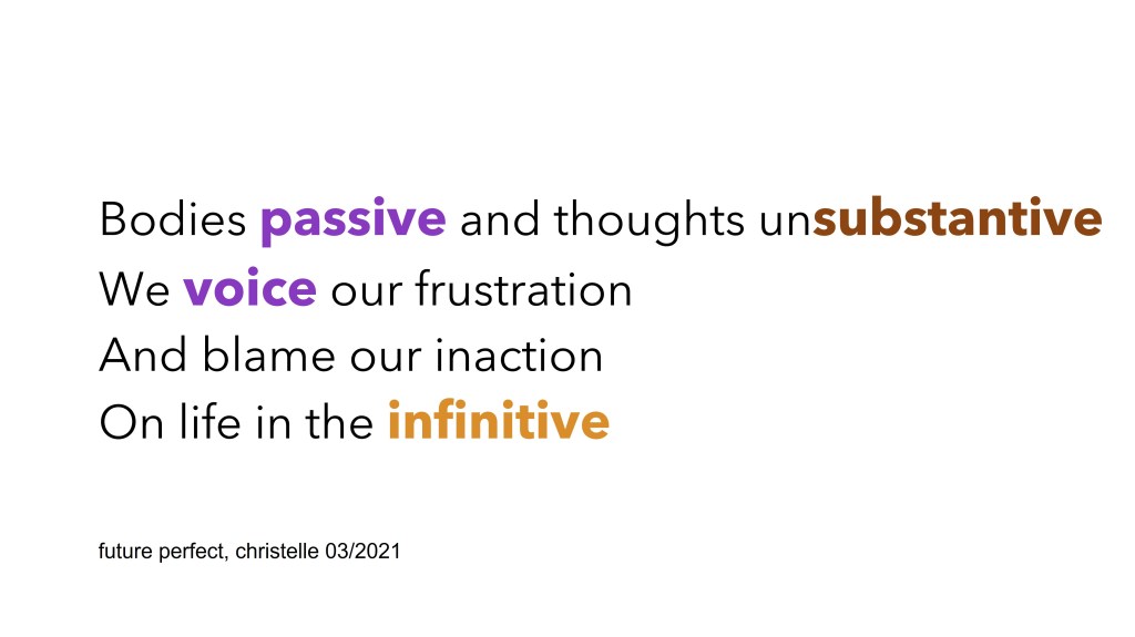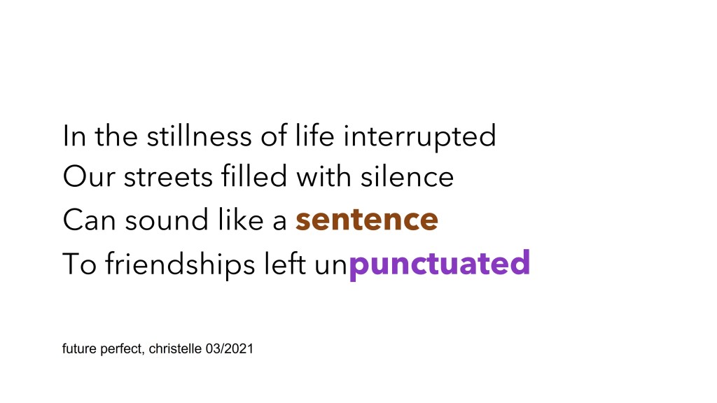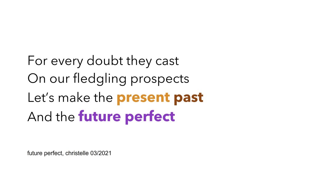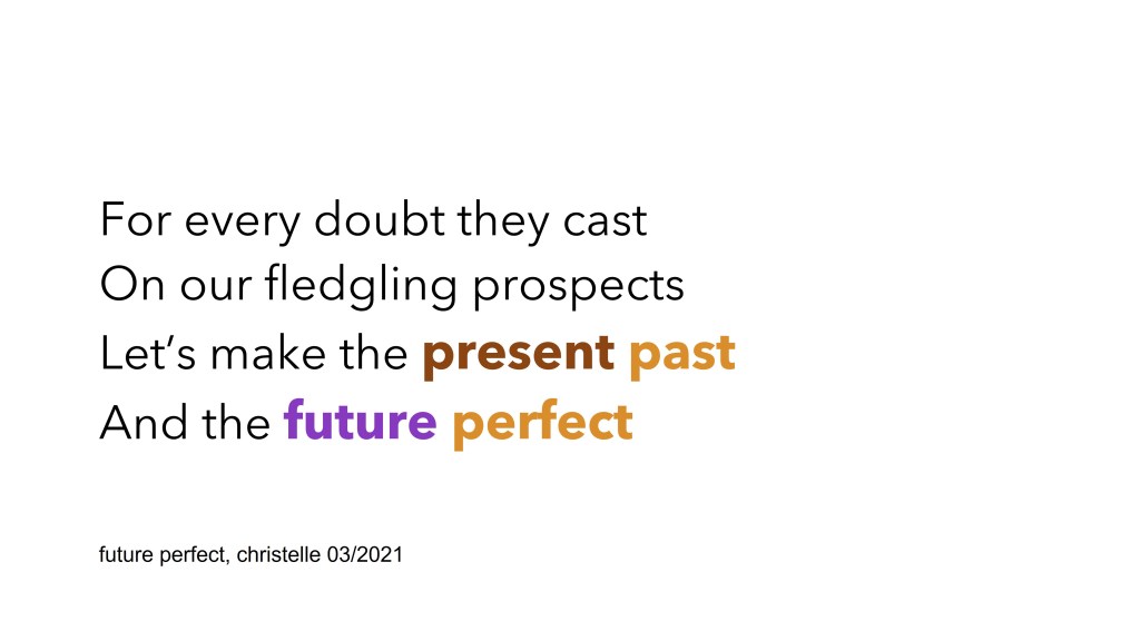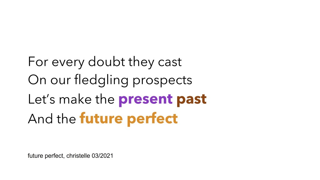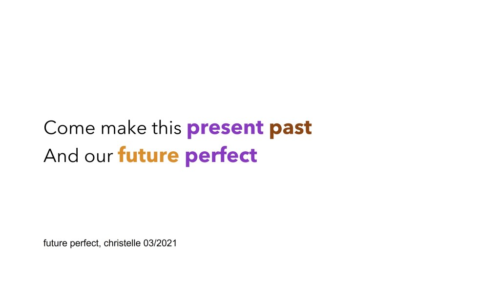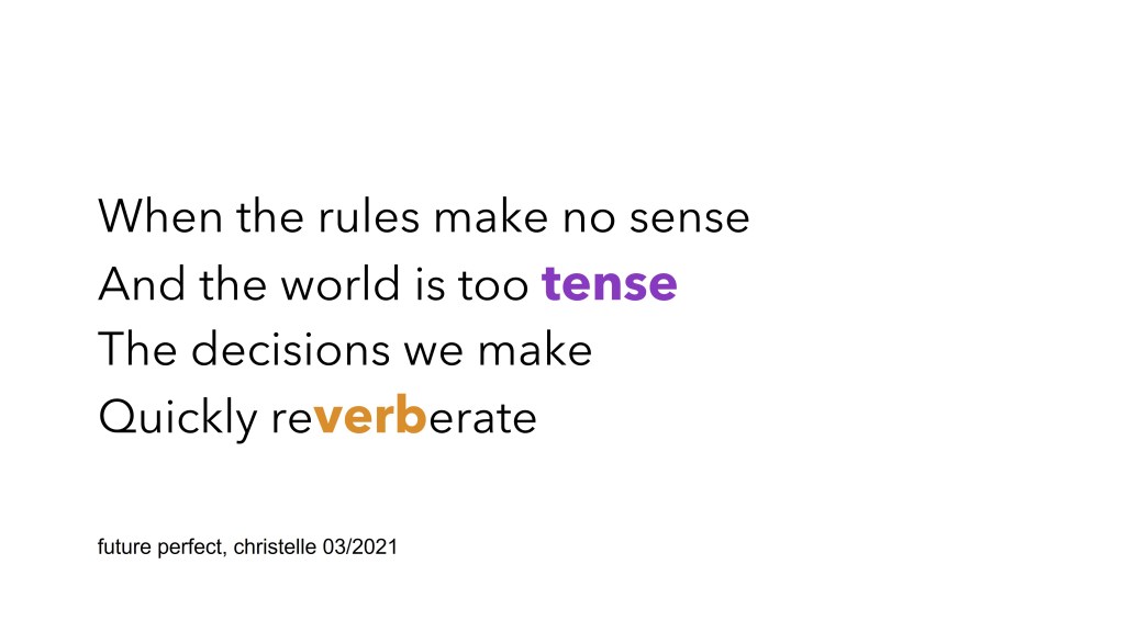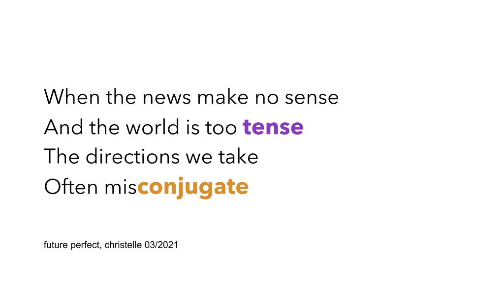 During the Covid-19 pandemic, artistic expressions became a refuge for many of us. As a linguist, I found inspiration in the intriguing album title Past Perfect Future Tense by the talented musician Magne Furuholmen. The way he plays with language sparked my creativity and led me to craft a poem centered around lockdown, using linguistic terms as the foundation. Written in March 2021, Future Perfect is a poetic reflection on our collective experience during those challenging times.